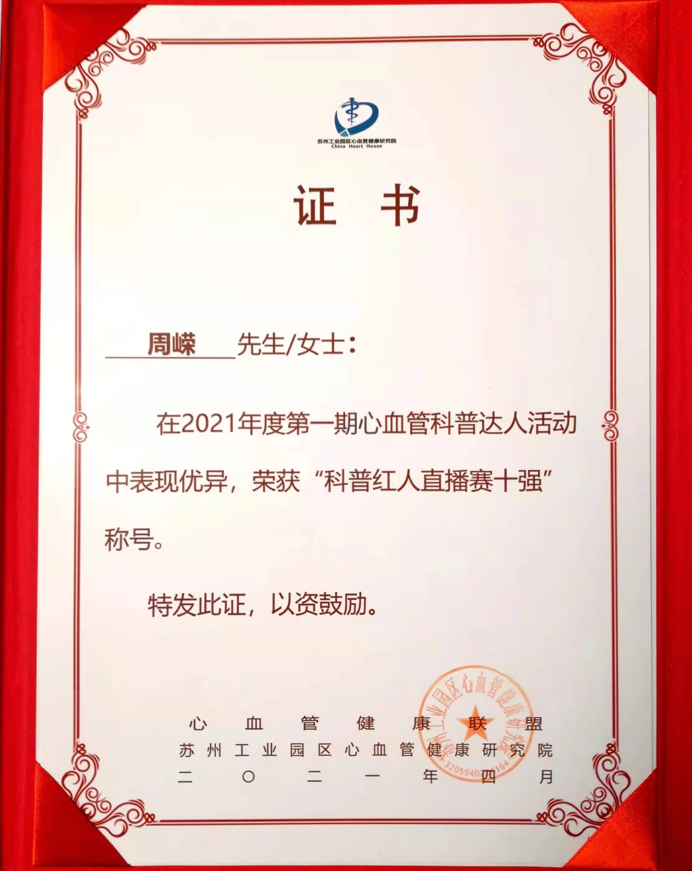 2021年 獲醫(yī)生云獎(jiǎng);獲“科普紅人直播賽十強(qiáng)”稱(chēng)號(hào)