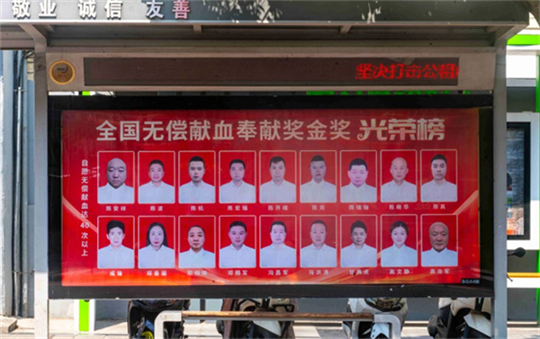 在第22個世界獻血者日到來之際,安康市中心血站精心策劃,自6月中旬起,在位于市政務大廳、市中心醫(yī)院、市中心醫(yī)院北院區(qū)門前的三處公交候車亭,以及中心城區(qū)兩處LED大屏上,全天循環(huán)展播著安康市榮獲“全國無償獻血奉獻獎”終身榮譽獎、金獎、銀獎、銅獎的獲獎者代表風采照片。