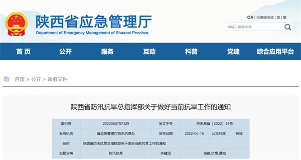 近期我省降水偏少,氣溫持續(xù)偏高,導(dǎo)致陜北北部、陜南東部、渭北出現(xiàn)輕到中度干旱,其中榆林、商洛、渭北局地出現(xiàn)嚴(yán)重干旱。后期降水仍將分布不均,旱情發(fā)展演變升級快,影響到工農(nóng)業(yè)生產(chǎn)安全。為做好當(dāng)前抗旱工作,現(xiàn)就有關(guān)要求通知如下: