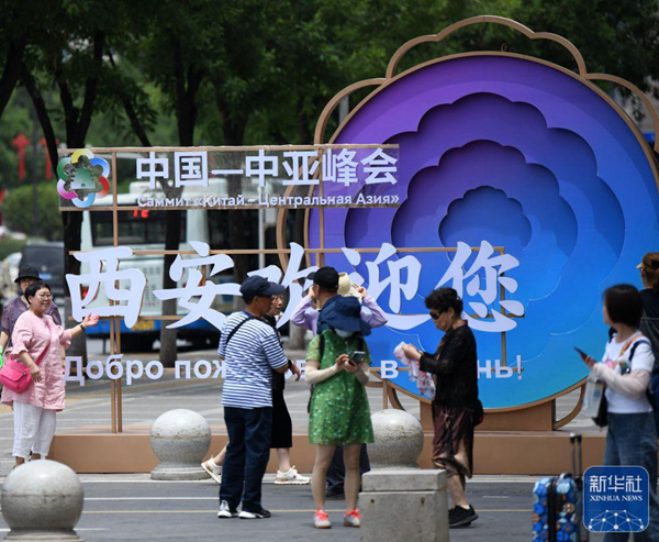 ↑5月16日,游客在西安市北大街上與中國-中亞峰會主題裝置合影。新華社記者 李一博 攝