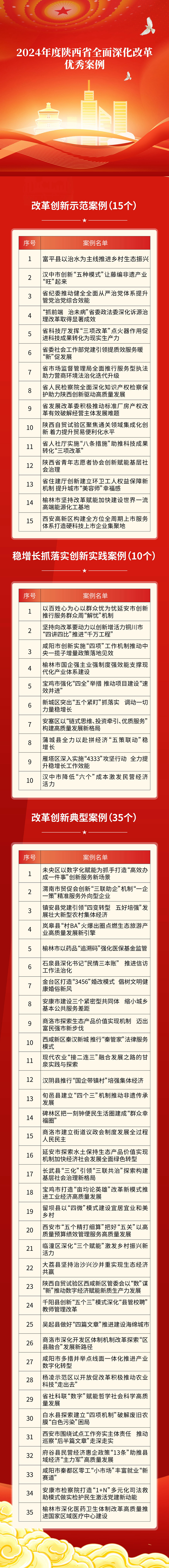 2024年度陜西省全面深化改革優(yōu)秀案例中,改革創(chuàng)新示范案例15個,包括富平縣以治水為主線推進鄉(xiāng)村生態(tài)振興等案例;穩(wěn)增長抓落實創(chuàng)新實踐案例10個,包括以百姓心為心以群眾憂為憂延安市創(chuàng)新推行服務群眾周“解憂”機制、堅持向改革要動力以創(chuàng)新增活力銅川市“四講四比”推進“千萬工程”、咸陽市創(chuàng)新實施“四項”工作機制推動中央一攬子增量政策落地見效等案例;改革創(chuàng)新典型案例35個,包括未央?yún)^(qū)以數(shù)字化賦能為抓手打造“高效辦成一件事”創(chuàng)新服務新場景、渭南市貿促會創(chuàng)新“三聯(lián)助企”機制“一企一策”精準服務外向型企業(yè)、鎮(zhèn)安縣黨建引領“四變轉型 五好培強”發(fā)展壯大新型農村集體經濟等案例。