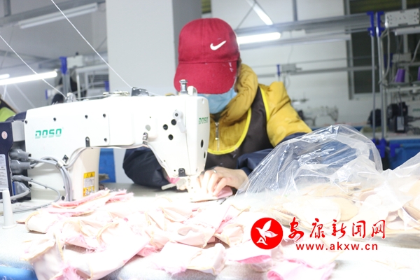 劉家溝社區(qū)工廠里,婦女們正嫻熟地踩著縫紉機(jī),在這里我們見到了同住包河村的貧困戶胡興英,據(jù)社區(qū)工廠經(jīng)理介紹,她是工廠里手腳最快、出勤率最高的人。“廠子剛辦起來(lái)她就來(lái)了,心靈手巧,一點(diǎn)不比年輕人差。”