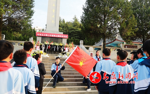 隨著激情昂揚的出旗曲奏響,祭奠活動開始。鮮艷的星星火炬旗幟緩緩向前,在明艷的紅色下,金燦燦的星星在陽光下格外耀眼。隨后,少先隊員們獻唱《我們是共產(chǎn)主義接班人》,大家滿懷熱情,為革命烈士訴說自己的情感。紀念碑前,伴隨著充滿哀思的《獻花曲》,幾位同學莊嚴地將花籃送上祭臺并整理挽聯(lián),同學們排隊上前送上自己手制的白花。高大的紀念碑在黃白菊花和淡雅白花的映襯下,格外莊嚴肅穆。