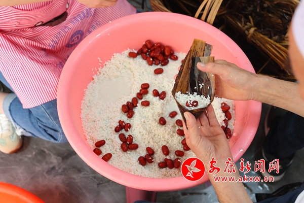 伴隨著一陣濃濃的糯米香撲鼻而來(lái),只見(jiàn)馬峰亮將筍殼粽葉疊放,彎成圓錐狀,抓起一撮泡好的糯米,填入本地紅豆沙,粽葉彎折捆扎后,一個(gè)有棱有角安康傳統(tǒng)豆沙粽就完成了。蒸煮兩個(gè)半小時(shí),剛出鍋的安康傳統(tǒng)手工粽,冒著騰騰的熱氣,剝開(kāi)粽葉,一口下去,軟糯香甜、筋道拉絲,回味無(wú)窮。