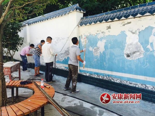 原來(lái)這是該校校園圍墻美化工程正在緊張的實(shí)施當(dāng)中,盡管酷暑難當(dāng),但學(xué)校領(lǐng)導(dǎo)依然堅(jiān)守崗位,工人師傅們更是揮汗如雨,認(rèn)真細(xì)心地做好每一道工序。該校近年來(lái)校園基礎(chǔ)設(shè)施建設(shè)發(fā)生了顯著變化,特別是總面積達(dá)12畝的塑膠操場(chǎng)建成后,更是讓原本清新整潔的校園新增了一道亮麗的風(fēng)景線。讓人感到美中不足的是原有500余米的圍墻墻面有些斑駁陳舊,學(xué)校積極爭(zhēng)取項(xiàng)目資金,并于7月4日正式開(kāi)始對(duì)圍墻進(jìn)行“美化”,秋季開(kāi)學(xué)之際,重返校園的師生將會(huì)看到一扇扇嶄新的、充滿(mǎn)人文氣息的文化宣傳墻。