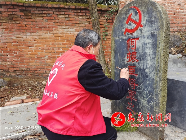 活動現(xiàn)場,該鎮(zhèn)10余名書法志愿者們向烈士鞠躬后,便小心翼翼地把墓碑上面的灰塵刷去,開始嚴肅認真地一筆一劃為烈士墓碑描摹碑文。每一筆,都刻畫了志愿者們對先烈們的沉痛追思;每一畫,都描摹著對新生活的無限感激。經(jīng)過3個多小時的努力,40余座革命烈士墓碑的字跡煥然一新,在陽光的照耀下,顯得格外清新醒目,志愿者們露出了欣慰的表情。