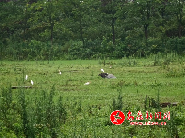 本網(wǎng)訊(通訊員 陳小惠)青青綠草地,牛伏月水畔,鷺鷥?nèi)逯,與牛共棲息。日前,在漢陰縣澗池鎮(zhèn)樅嶺村月河之畔,一頭水牛正悠閑地臥在草地上小憩,幾只白鷺時(shí)而單腳站立在牛背上,時(shí)而俏皮地繞牛飛翔,構(gòu)成一幅優(yōu)美的動(dòng)態(tài)畫(huà)卷。