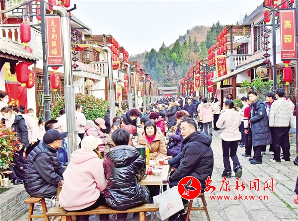 “開席啰……”隨著一聲鑼響,充滿儀式感的省級(jí)非遺庖湯盛宴正式開始。古色古香的店鋪門頭掛滿紅燈籠,石板鋪成的長(zhǎng)街上,賓客8人一桌圍爐而坐,道道美食依次上席,說菜人“口吐蓮花”,菜越說越香;酒歌高亢,越喝越暖;猜拳行令,秦巴漢子盡顯豪邁風(fēng)采;作坊小鎮(zhèn)高朋滿座,滿滿年味十里香飄。