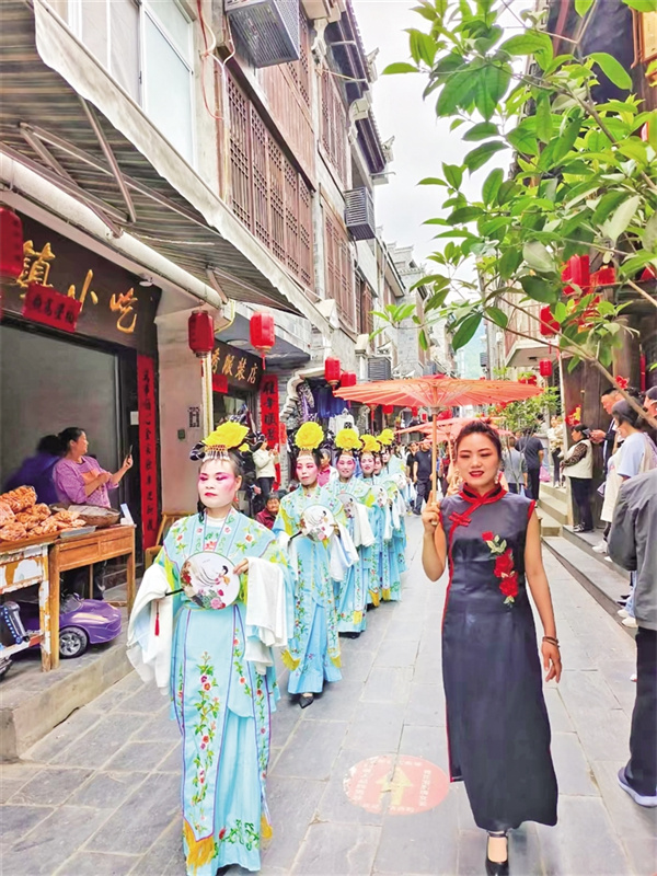 “過去總說‘捧著金飯碗要飯’,現(xiàn)在我們讓老手藝成了新飯碗。”古鎮(zhèn)“裕慶和”店面里,負責人李俊沏上一壺富硒茶,忍不住發(fā)出感嘆。這位扎根故鄉(xiāng)創(chuàng)業(yè)傳承非遺的“領頭雁”,將祖?zhèn)鞯陌舜蠹缦蛟斐闪裂勖K_發(fā)的“古鎮(zhèn)兩日游”線路,將美食體驗與民宿客棧、茶社書院有機結合,年接待游客上萬人次。
