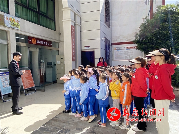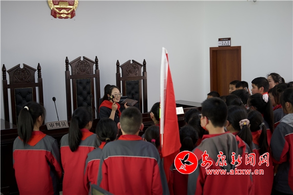 在參觀過程中,干警帶領(lǐng)同學(xué)們走進(jìn)訴訟服務(wù)中心和干警辦公室了解了法院干警的工作場所。隨后,帶領(lǐng)同學(xué)們參觀審判庭,現(xiàn)場向同學(xué)們介紹科技審判法庭的功能及庭審流程,并展示了法袍、法槌和法徽,同時(shí)用深入淺出的語言和提問互動(dòng)的方式向孩子們講解了法袍、法槌和法徽的象征意義,同學(xué)們興趣濃厚,紛紛走上審判臺,親身感受和觸摸審判設(shè)施,感受法庭審判的嚴(yán)肅和莊重。