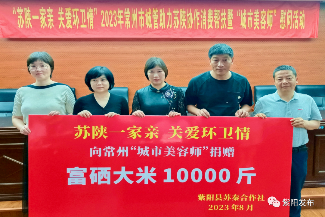 活動上,紫陽縣蘇秦農產品專業(yè)合作社向常州市環(huán)衛(wèi)工人捐贈了10000斤紫陽大米作為慰問品,并與10家企事業(yè)單位簽訂了消費幫扶產品購銷意向協議。