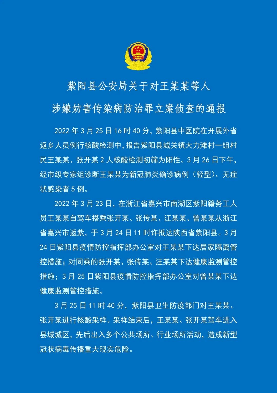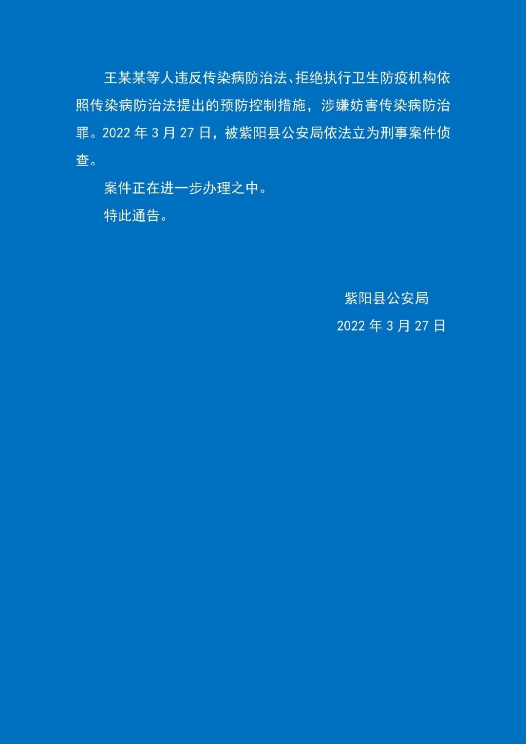紫陽縣公安局關(guān)于對(duì)王某某等人涉嫌妨害傳染病防治罪立案偵查的通報(bào)