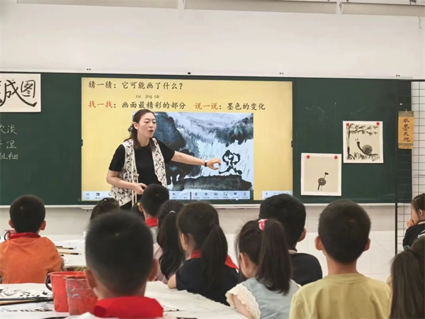 活動中,鐘樓第二實驗小學副校長方文婷和常州經開區(qū)教學部主任楊婷老師分別呈現了一年級美術課程《葉子片片》和《練筆成圖》。兩位老師的課程內容充滿創(chuàng)新與深度。授課內容從印刷術與拓染法相結合,引導學生們探索美術與生活的緊密聯系,到通過手指操的引導,幫助孩子們在逐漸掌握水墨畫的基本坐姿和執(zhí)筆方法中感受傳統(tǒng)文化魅力。