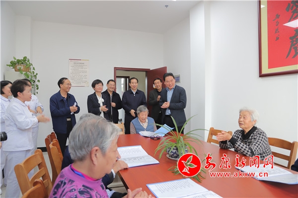 漢濱區(qū)陽光護理院,秋日和煦、窗明幾凈,五彩繽紛的小風車隨風輕動,一派安逸恬靜的幸福景象。趙俊民拉著老人們的手親切詢問:“老人家,身體好健旺!住在這里感覺怎么樣?”老人連聲稱道:“好哇,好哇!吃得好,住得好,環(huán)境好,還有一幫老伙伴,大家都很開心!”看到老人們紅光滿面、精神矍鑠,趙俊民對護理院的工作予以充分肯定,要求大家要做到愛心、細心、耐心,努力為老人們營造更好的生活環(huán)境。
