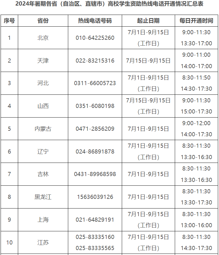 今年暑期,教育部將繼續(xù)開通高校學生資助熱線電話,號碼為010—66097980、010—66096590,受理時間為7月1日—9月15日,每天8:00—20:00,為大學新生特別是家庭經(jīng)濟困難的大學新生提供資助政策咨詢與幫助。