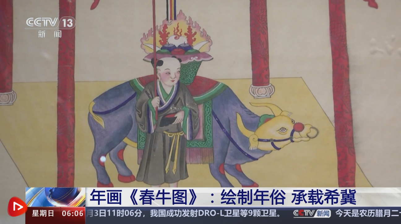 《春牛圖》也稱為《句芒神牛圖》,這幅《春牛圖》繪制于清光緒五年,圖中春牛和句芒神的位置和顏色均與當(dāng)年的五行干支相關(guān)。在清代,每逢立春時(shí)節(jié),順天府都會(huì)向皇家獻(xiàn)上《句芒神牛圖》用于迎春儀式。它不單是一幅畫,更承載著人們對(duì)于新的一年風(fēng)調(diào)雨順、喜獲豐收的美好愿望。