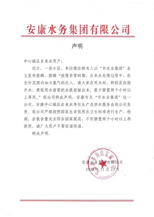 近日,一些小區(qū)、單位微信群有人以“市水業(yè)集團(tuán)”名義發(fā)布提醒,提醒“疫情非常時(shí)期,自來水處理過程中,在允許范圍內(nèi)加大氯氣的注入。請(qǐng)大家在用水時(shí),特別是在燒開水、煮飯用水前要把水提前接出來,最少靜置兩個(gè)小時(shí)以上再用。”我公司特此聲明,安康市無“市水業(yè)集團(tuán)”這一公司,安康中心城區(qū)自來水凈化生產(chǎn)及供水服務(wù)由我公司負(fù)責(zé)。我公司嚴(yán)格按照國家生活飲用水衛(wèi)生標(biāo)準(zhǔn)進(jìn)行生產(chǎn)、檢測(cè),余氯含量完全符合國家規(guī)范,不用靜置兩個(gè)小時(shí)以上再使用。請(qǐng)廣大用戶不要信謠傳謠。