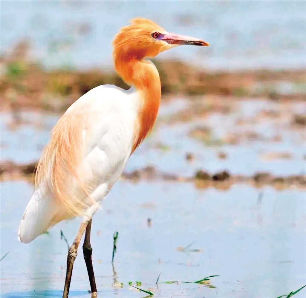 夏羽大都白色;頭和頸橙黃色,前頸基部和背中央具羽枝分散成發(fā)狀的橙黃色長形飾羽;前頸飾羽長達(dá)胸部,背部飾羽向后長達(dá)尾部,尾和其余體羽白色。冬羽通體全白色,個(gè)別頭頂綴有黃色,無發(fā)絲狀飾羽。橙黃色的喙長、尖而直,較側(cè)扁、尖端多有小鋸齒;翅較寬長,前頸的基部和背部中央具有羽枝分散成發(fā)狀的橙黃色長飾羽、前頸的飾羽長達(dá)胸部,背部的飾羽向后長達(dá)尾部。牛背鷺喜歡站在牛背上或跟隨在耕田的牛后面啄食翻出來的昆蟲和牛背上的寄生蟲等,因此得名。(來源:安康市林學(xué)會(huì))