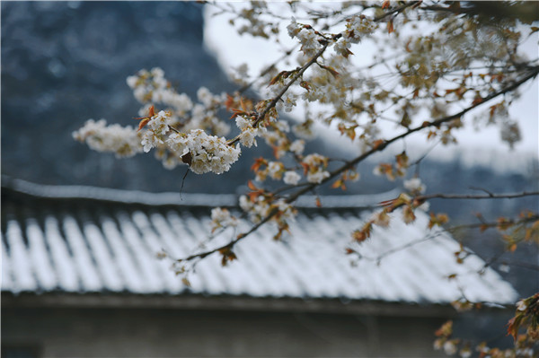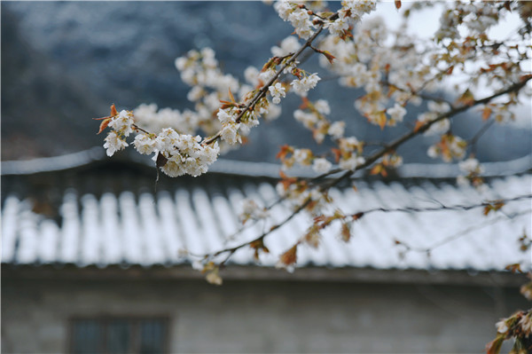 2月25日,石泉縣迎來了新年的第一場雪,高山處的村莊變得銀裝素裹,農家小院旁的櫻花開滿枝頭,潔白的櫻花與雪花共舞,為新年增添了更多的樂趣。(儲招賢 攝)6ag安康新聞網(wǎng)