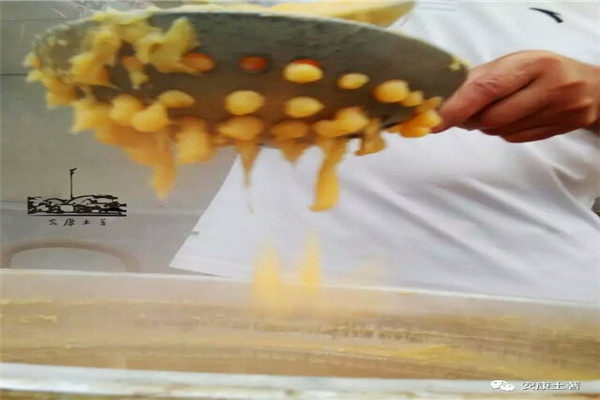 做面魚兒用的工具是漏勺,最早是用大葫蘆切兩半所做的葫蘆瓢,用燒紅的火鉆鉆出一個個的小洞,后來有了鋁制漏勺就很少有人再用葫蘆瓢了。