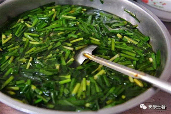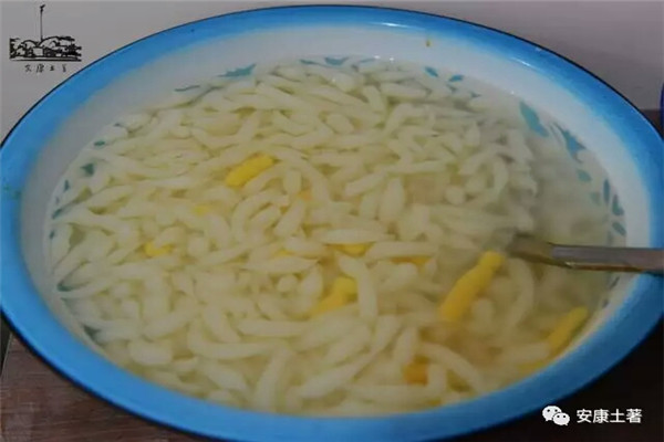另一種安康的,叫“漿水面魚兒”,面魚兒是有黃色、白色兩種,黃色用包谷面、白色用米粉或菱角粉做成,配著漿水、漿水菜、大蒜辣子、炒韭菜和油潑辣子吃。