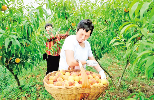 四月桃花猶在眼,而今碩果滿枝頭。眼下,正值黃桃成熟季,漢濱區(qū)關(guān)廟鎮(zhèn)文化村的300畝桃園內(nèi)一個個豐盈飽滿的黃桃掛滿枝頭,在陽光照耀和綠葉掩映下粉嫩透紅,沁人心脾的桃香撲鼻而來。